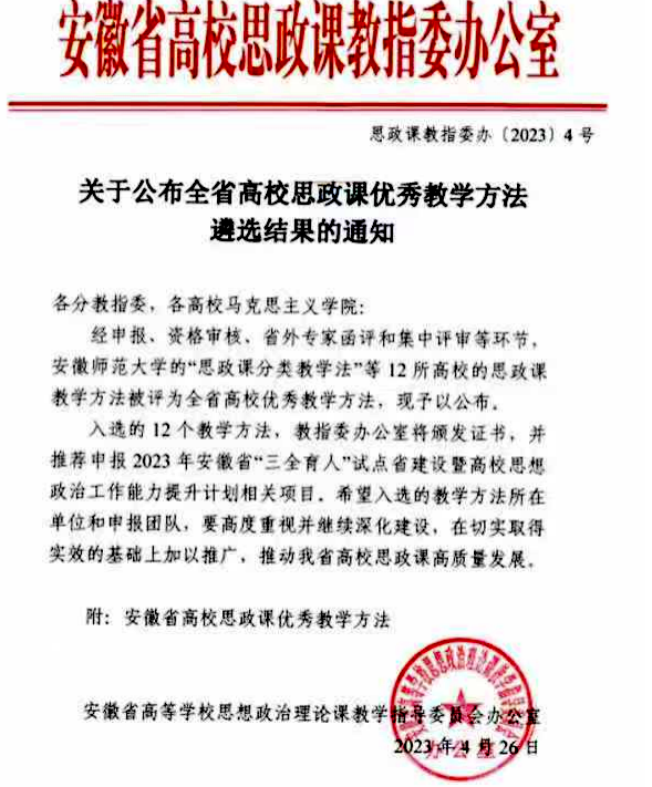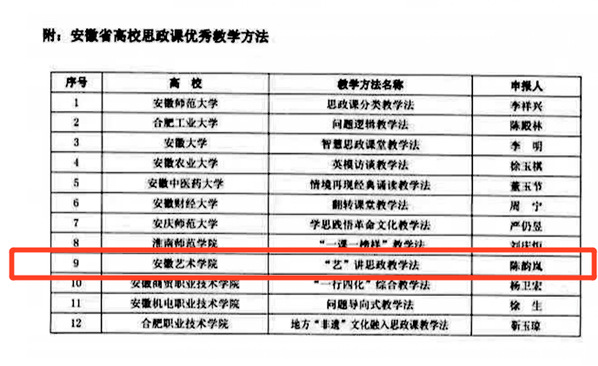 4月26日,安徽省高等学校思想政治理论课教学指导委员会公布全省高校思政课优秀教学方法遴选结果,金沙集团马克思主义学院副院长陈昀岚主持的“艺”讲思政教学法成功入选。
