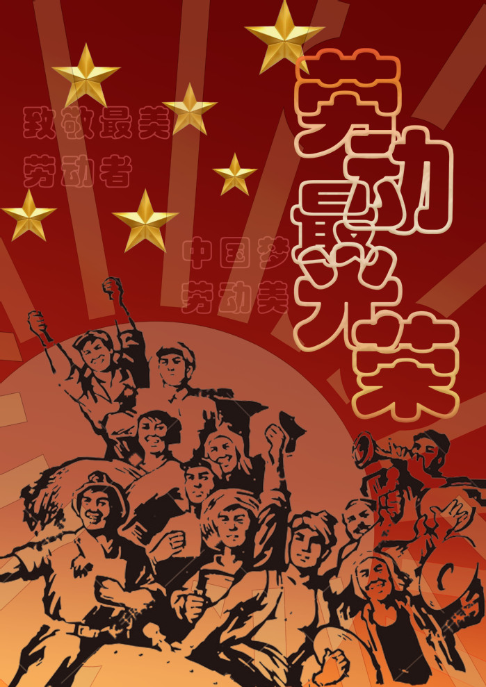 本海报主题为“劳动”,主要是把劳动者与国家紧密结合。在其背景色上,主色调为中国红,主要强调中国的劳苦大众的不怕苦不怕累和血气方刚的精神;在海报的下面部分为黑色的劳动人民的剪影,为了压整体的色调,不让其有轻飘飘的感觉;左上角的五角星正与背景色相呼应,能让观众联想到国旗,进而联想到劳动者与国家之间的关系,从而产生思考。