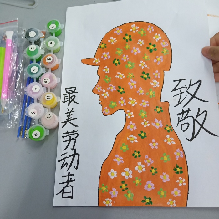 采用橙色颜料,橙色象征着阳光,也意味着劳动者像光一样发亮,蒸蒸日上。劳动者轮廓用彩色花朵填充,意味着所有的劳动者都是祖国的花朵,他们也孕育着祖国下一代的花朵。最美劳动者,值得我们的尊重。