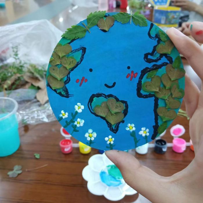 本作品属于手工制作类,由各色丙烯颜料、象征幸运的四叶草、圆形瓦楞纸板制作而成。
