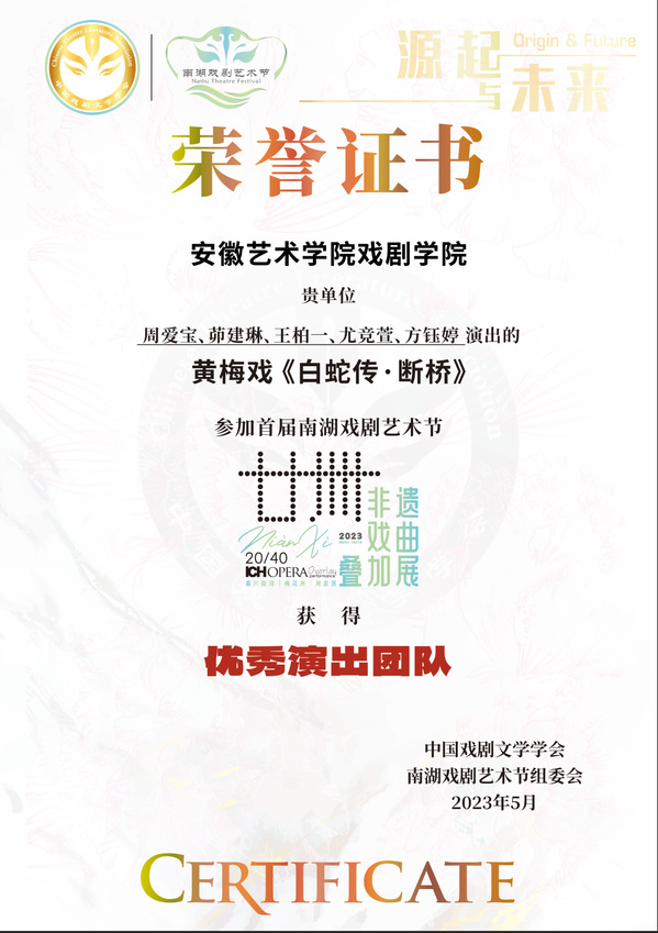 5月29日,2023南湖戏剧艺术节“廿卌非遗戏曲叠加展”评选结果揭晓,金沙集团888881戏剧学院黄梅戏《白蛇传·断桥》团队荣获优秀演出团队奖。