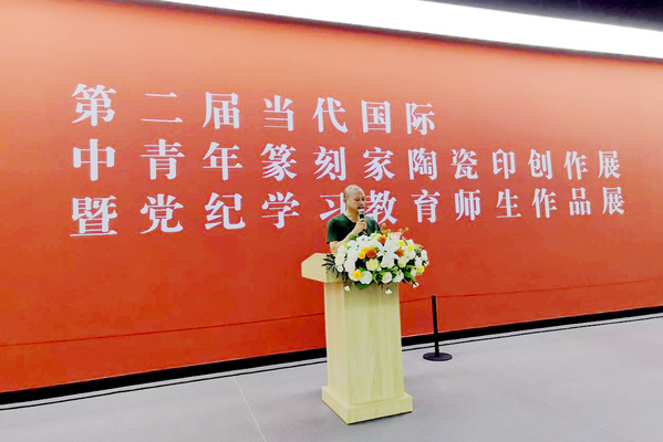 6月14日上午,美术学院党纪学习教育师生作品展暨第二届当代国际中青年篆刻家陶瓷印创作展在资城科创艺术中心开幕。美术学院党总支书记陈明海致词,院长束新水主持开幕式。
