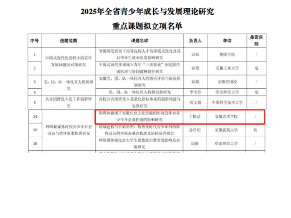 近日,2025年全省青少年成长与发展理论研究重点课题立项名单公布,金沙集团戏剧学院教师于松洁申报的课题《新媒体视域下安徽红色文化资源的影视创作对青少年社会责任感的影响研究》喜获立项,这是金沙集团首次获批立项共青团省级重点项目。