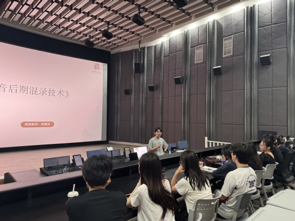 培训充分利用混录棚专业设施设备,帮助学生深入了解电影声音后期制作技术,提升专业设备与软件的实际操作能力。培训特邀传媒学院教师武隆浩担任主讲,采用“理论解析+实操训练”相结合的教学模式。学员们在导师指导下,深度体验电影声音混录的全流程工艺。