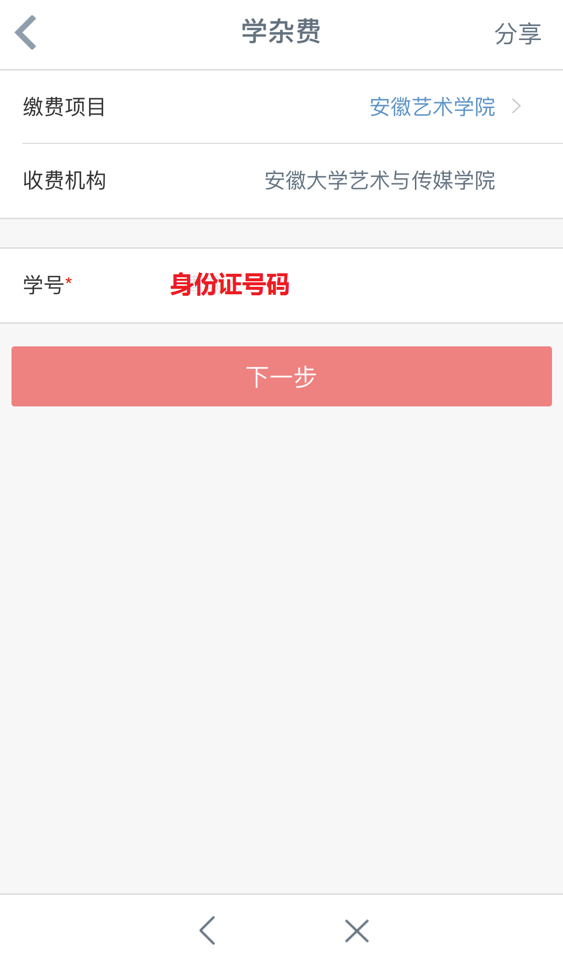4.缴费项目选择金沙集团888881,学号填写学生本人身份证号码,点击下一步。
