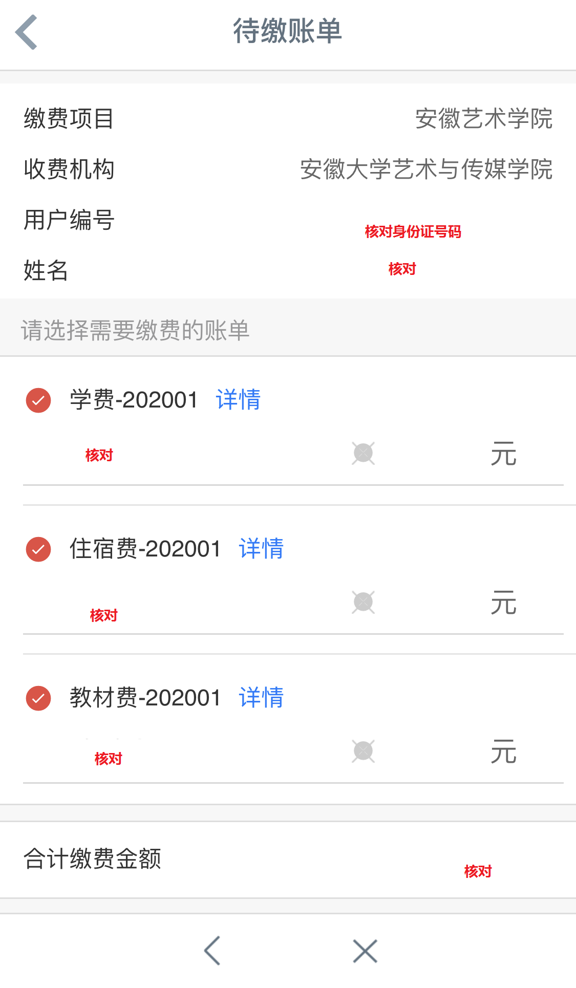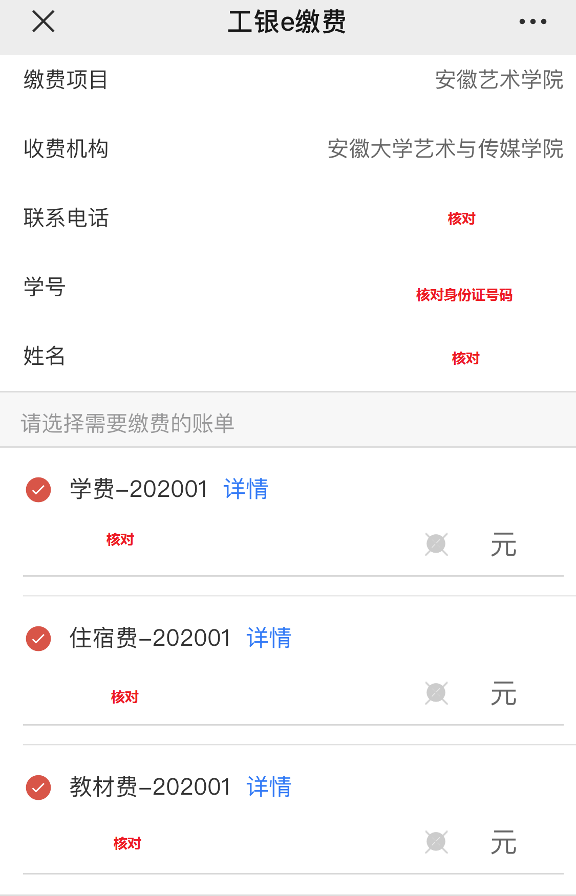 5.核对学号(即身份证号码)、姓名、学费、住宿费、书本费等相关信息无误后,点击缴费。