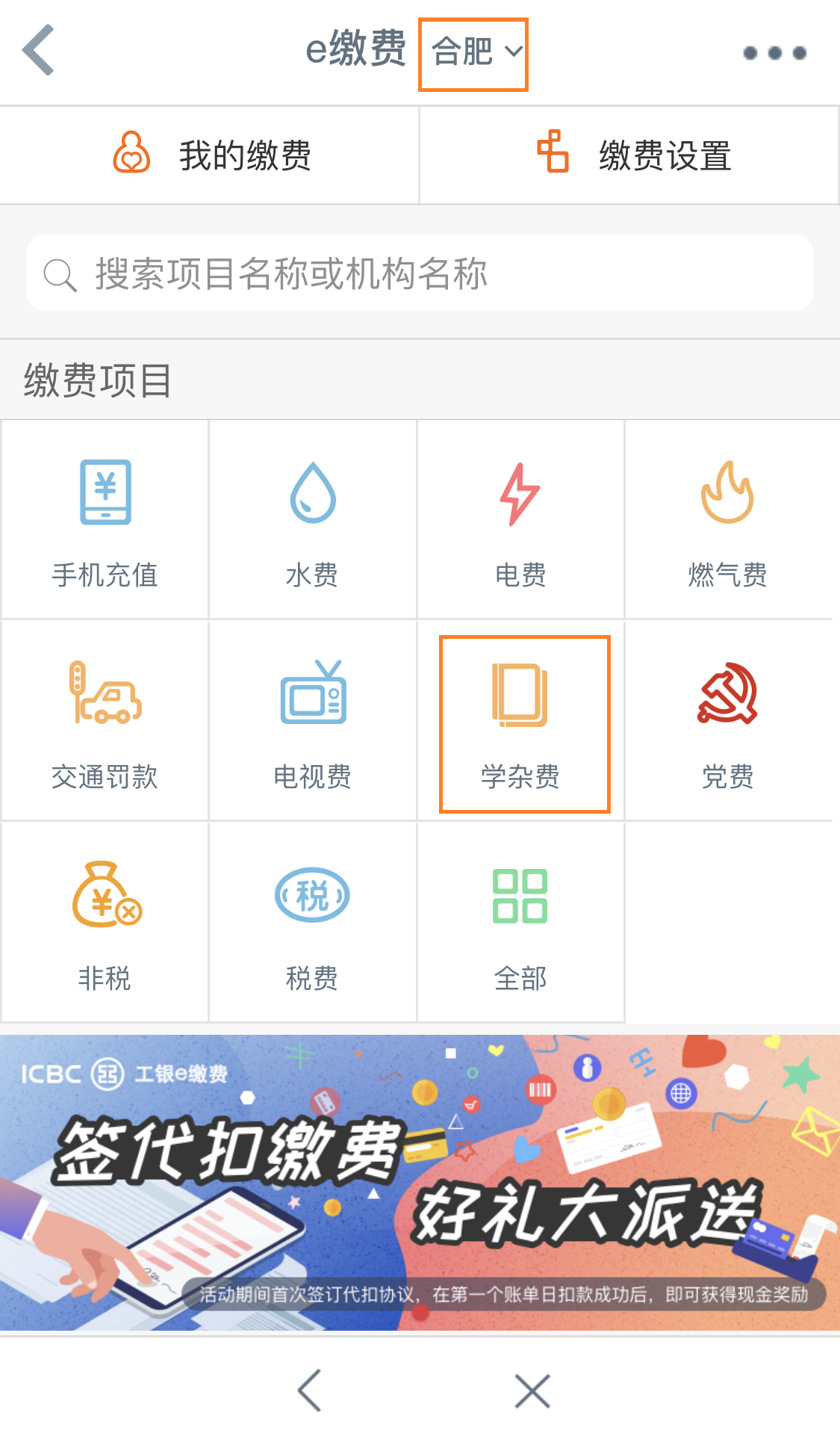 3.进入e缴费界面后,将位置选项确定为合肥,点击学杂费。