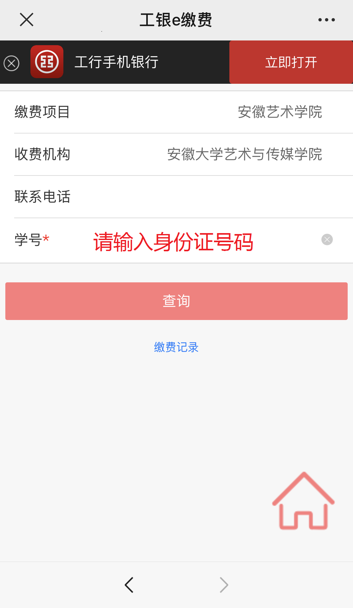 2.扫码后进入以下界面,请在学号栏内输入学生本人身份证号码,点击查询。