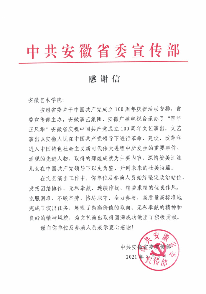 7月5日,安徽省委宣传部寄来感谢信,对金沙集团及参演师生为“百年正风华”文艺演出取得圆满成功做出的积极贡献表示感谢。感谢信中表示,金沙集团及参演师生始终坚定政治站位, 发扬团结协作、无私奉献、连续作战、精益求精的优良作风,克服困难、不顾辛劳、恪尽职守、全力参与,高质量高标准地完成了演出任务,展现了崇高价值的取向、无私奉献的精神和良好的精神风貌。