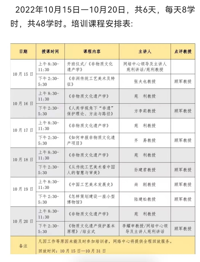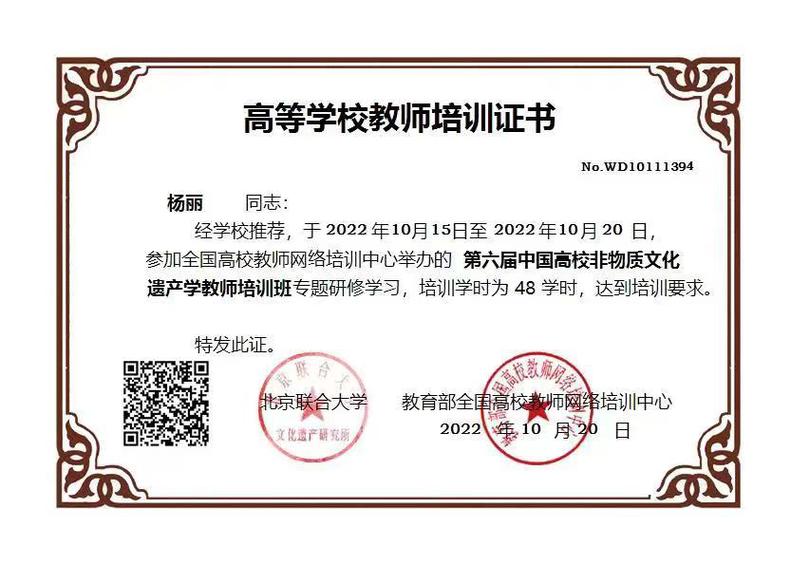 全国高校教师网络培训中心、北京联合大学文化遗产研究所,于2022年10月15日-10月20日联合举办第六届“中国高校非物质文化遗产学教师培训班”。中心主任杨丽参加本次网络培训。