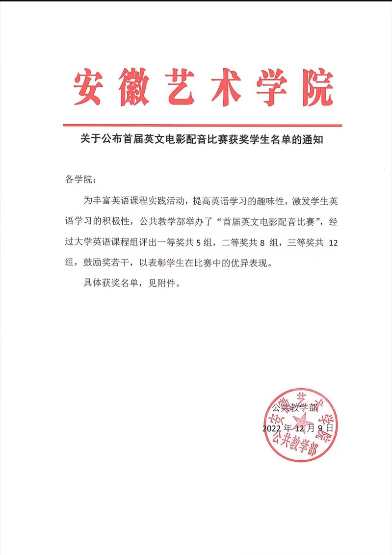 关于公布首届英文电影配音比赛获奖学生名单通知