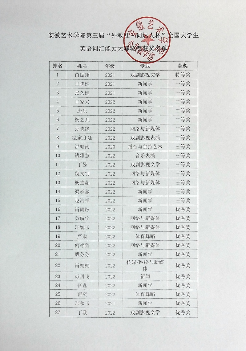 第三届“外教社、词达人杯”全国大学生英语词汇能力大赛校赛获奖名单
