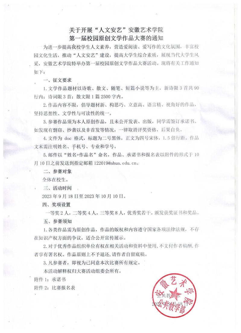 关于开展“人文安艺”金沙集团888881第一届校园原创文学作品大赛的通知