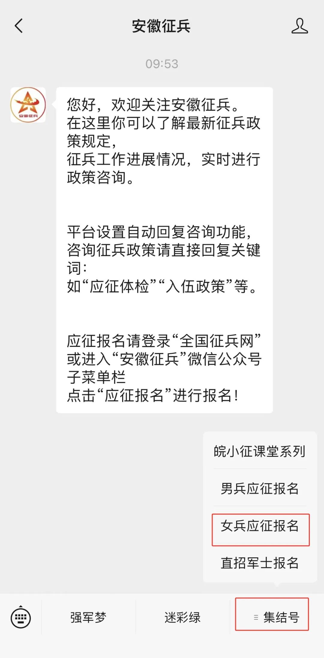 关注“安徽征兵”公众号,点击“集结号”按钮,即可进入报名页面。