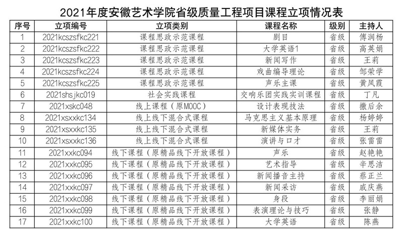 本次学校获批省级质量工程课程项目共计17项,涵盖课程思政示范课程、社会实践课程、线上课程(原MOOC)、线上线下混合式课程、线下课程(原精品线下开放课程)等类别。