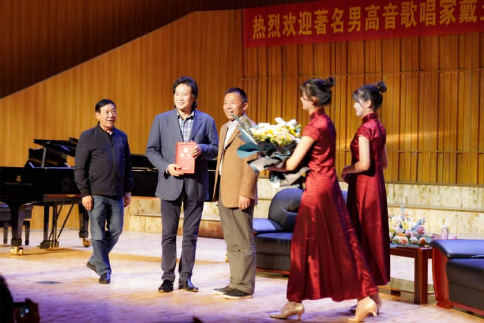 10月10日晚,著名男高音歌唱家戴玉强受聘金沙集团客座教授并在音乐南楼音乐厅举行声乐艺术分享会。受聘仪式及声乐艺术分享会由音乐舞蹈系主任孙来法主持。