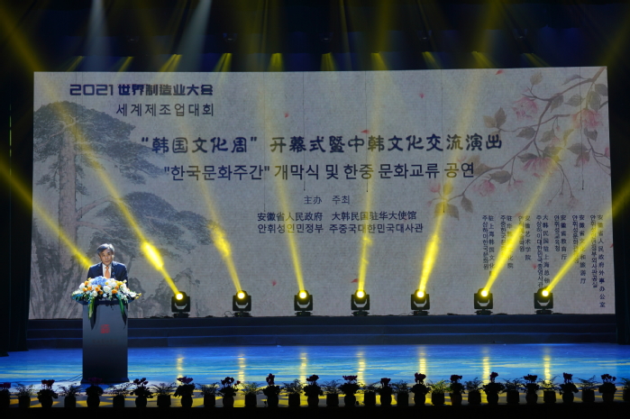 金胜镐宣布韩国文化周正式开幕。他在致辞中表示,世界制造业大会是一个促进两国文化交流的契机,可以达到“你中有我,我中有你”。韩中两国有悠久的历史渊源,希望能通过这一场活动,让缘分更加深厚。