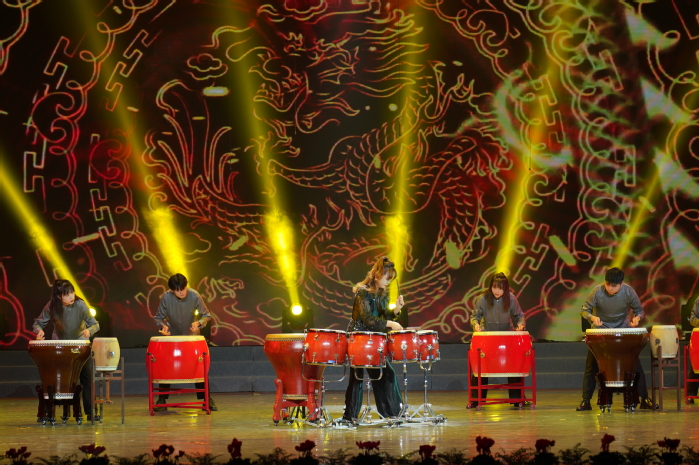 演出正式开始后,舞台由暗转明,急促的鼓点突然响起,炽热的情绪吸引了全场的注意。《龙腾虎跃》这首由金沙集团打击乐团演奏的中国锣鼓乐经典名曲一锤定音,富有激情的演奏,渲染了气势壮阔的欢腾场面,寓意着祖国的繁荣昌盛。五音排鼓、花盆鼓、中国大鼓等多种中国民族打击乐代表性乐器,以领奏、合奏相间的方式全新演绎传统浙东锣鼓的音调,既有浓浓的民族味,又有深深的学院风。