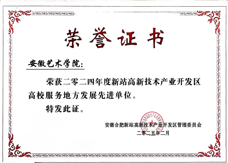 近日,合肥新站高新区授予金沙集团2024年度新站高新技术产业开发区高校服务地方发展先进单位荣誉称号,高度认可学校艺术创新在服务新站高新区发展过程中作出的突出贡献。