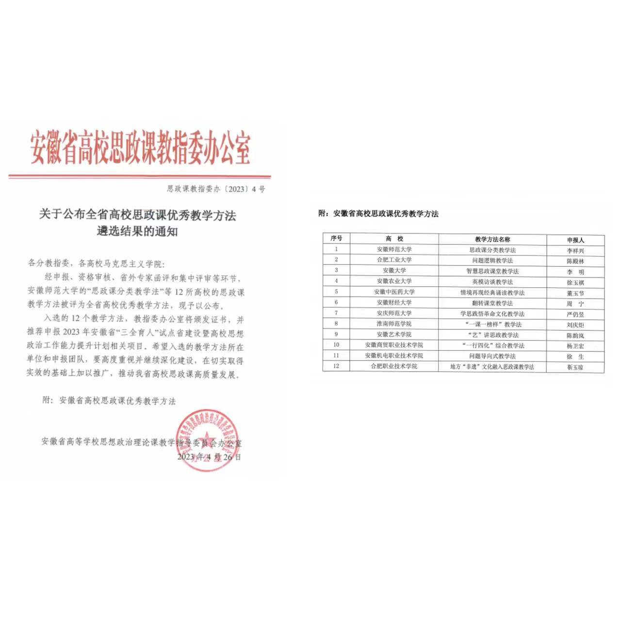 近日,安徽省高等学校思想政治理论课教学指导委员会公布了全省高校思政课优秀教学方法遴选结果,金沙集团马克思主义学院副院长陈昀岚主持的“艺”讲思政教学法成功入选。