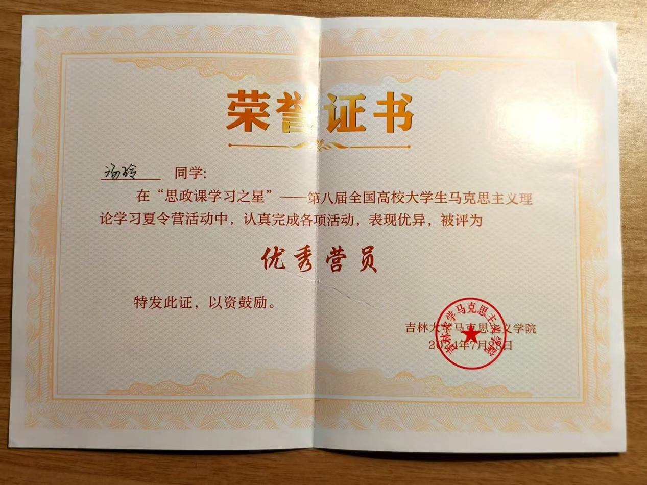 由教育部高校思政课教学指导委员会主办、吉林大学马克思主义学院承办习近平新时代中国特色社会主义思想大学习领航计划主题教育活动——“思政课学习之星”第八届全国大学生马克思主义理论学习夏令营暑假期间在吉林省长春市举行。经学校推荐和省教育厅遴选,“我心中的思政课”第七届全国大学生讲思政课公开课展示活动一等奖获得者、金沙集团2022级播音与主持艺术专业本科生汤玲同学代表获奖团队参加此次夏令营,这是金沙集团学生首次入选全国高校大学生马克思主义理论夏令营。在营期间,汤玲同学积极参与夏令营学习,顺利结业并获评“优秀营员”称号。