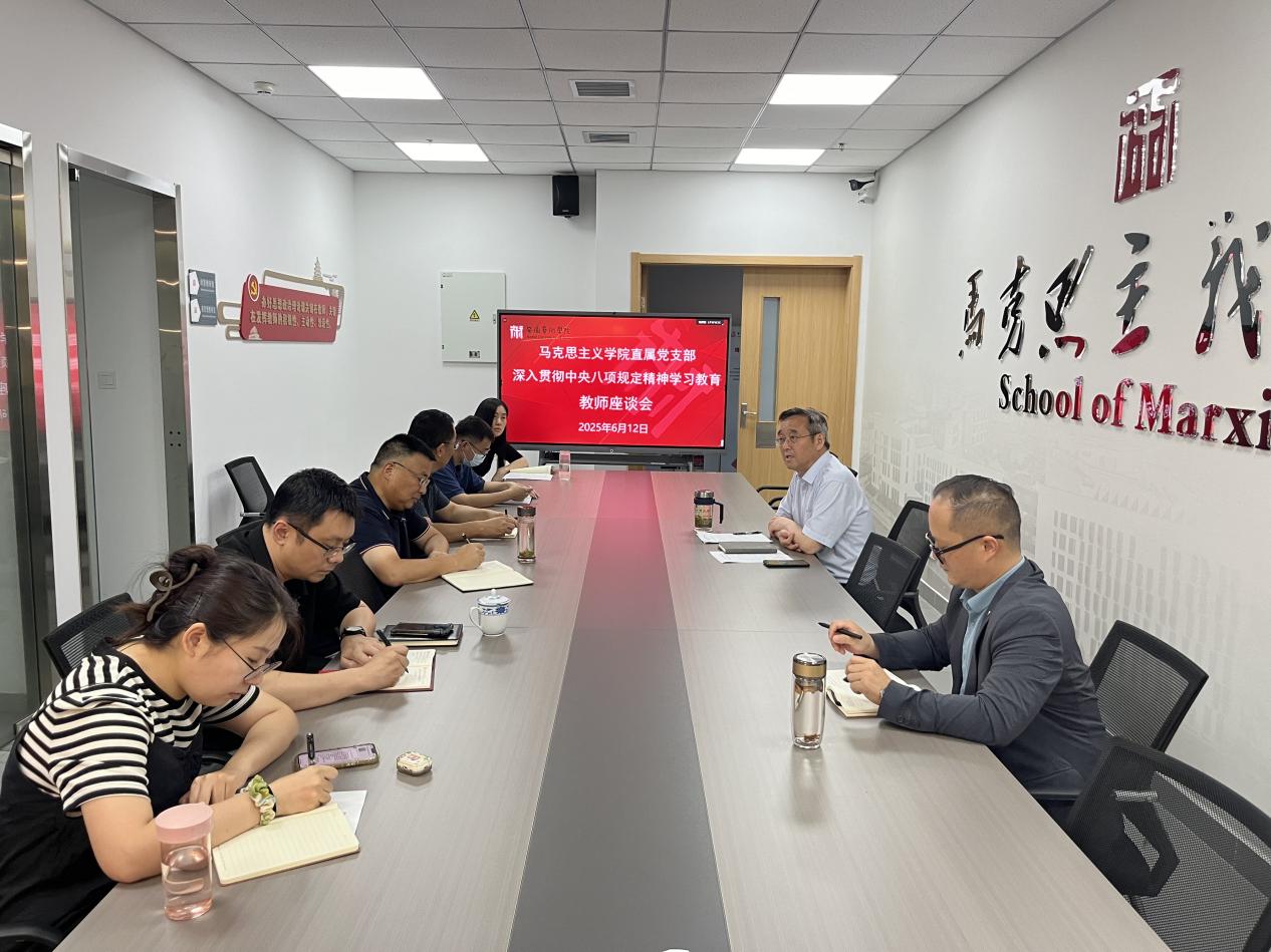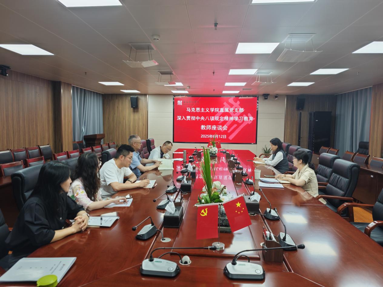 为进一步提升学习教育效果,集中整治突出问题,增强领导干部持续落实中央八项规定精神的决心,切实改进工作作风,6月12日中午,马克思主义学院直属党支部在崇德楼716和721会议室分教研室召开了深入贯彻中央八项规定精神学习教育征求意见教师座谈会,面对面征求广大教师的意见建议。全体专兼职思政课教师参加会议。