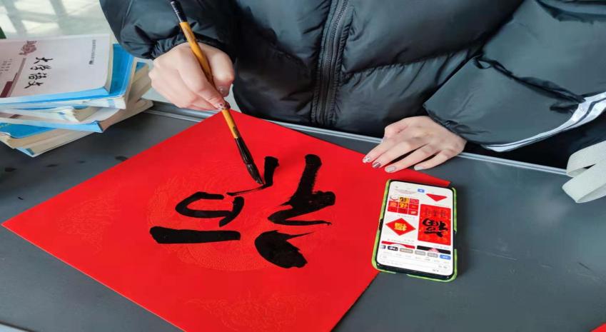同学们带着新年的祝福挥毫泼墨笔走龙蛇全神贯注书写着春联个个忙得不亦乐乎把一幅幅体现着“欢乐和谐”、“平安祥和”等主题的春联无偿送到师生手中会场里的每个人都有条不紊地做着相关工作整个会场都被喜庆的红色渲染了