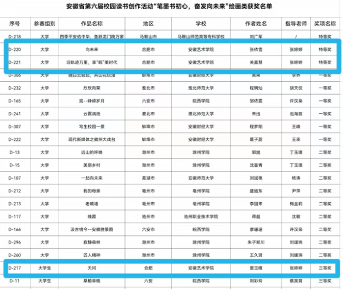近日,由省委教育工委、省教育厅、省人力资源和社会保障厅、省文化和旅游厅、省新闻出版局、团省委共同主办的安徽省第六届“笔墨书初心,奋发向未来”创作活动圆满结束。我院在此次活动中获得特等奖2项、三等奖1项、优秀奖1项。学院“双百人才”、书法学专业负责人张典友副教授获优秀指导教师奖。
