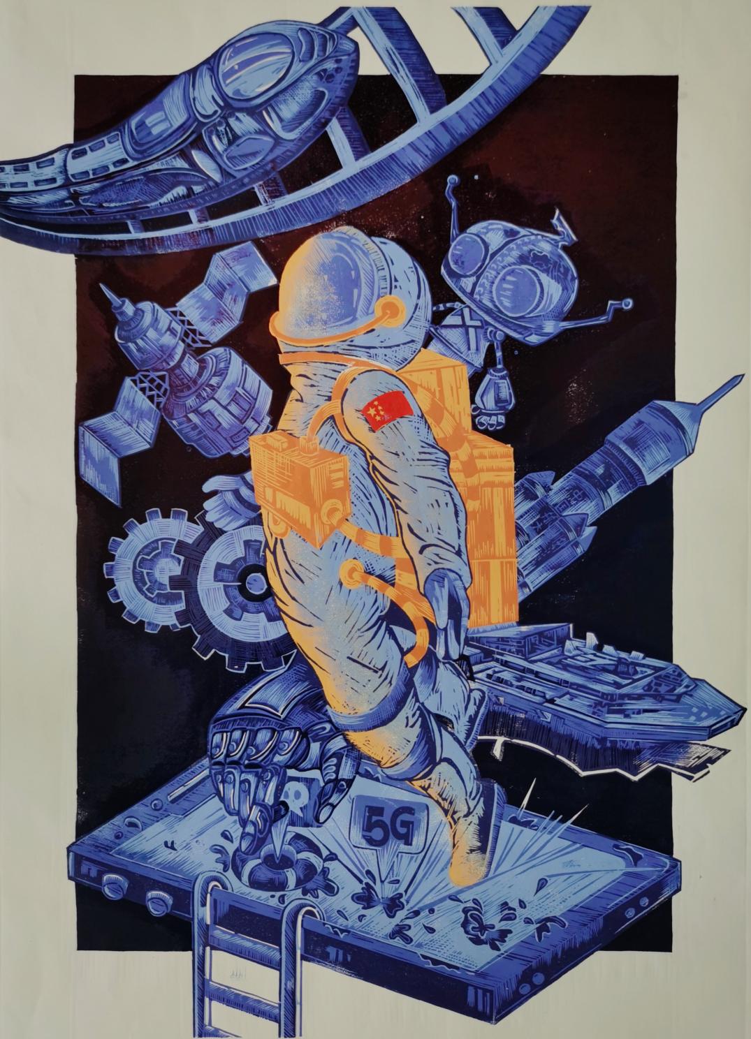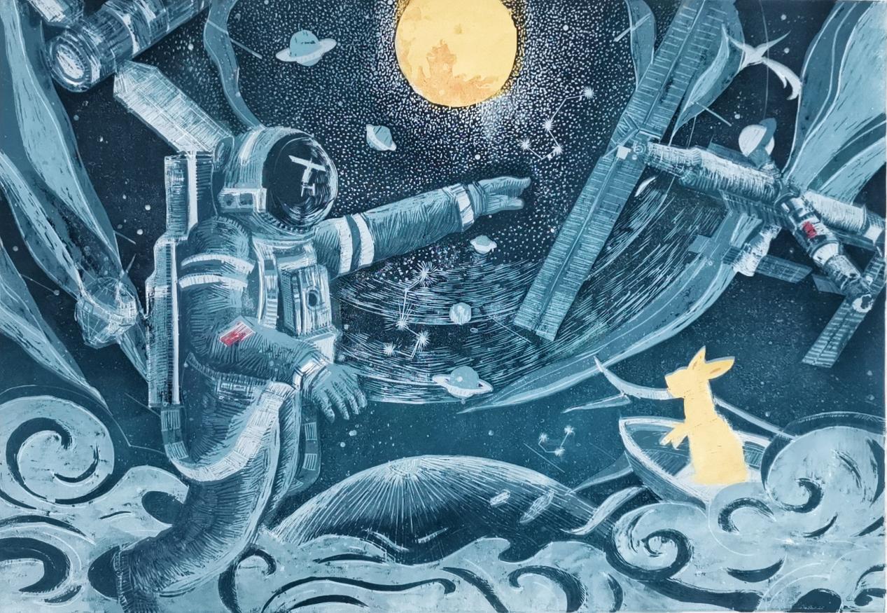 《沿轨迹万里,享皖美时代》关嘉慧 油印套色木刻 (特等奖)