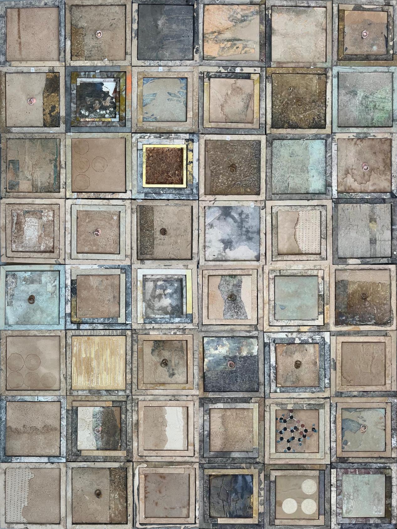 作品《百草济世》视角不局限于对某一个人物或某一事件进行叙事性表现,而是用代表性物品或痕迹作为主要描绘对象,以此表现中医药文化的内容与内涵。作品以中药房药柜为画面结构原型,中药柜方形的格子识别度极高,它也是中国传统医药里常见且有代表性的物品。一般来说绘画的三维空间都是虚拟的,并非现实里的空间,在作品里我有意将空间感融入进了绘画里。面对这一问题时,利用木板和木框自身厚度营造出高低起伏的层次结构,最终出现了是半平面化效果,这样就同时兼顾了空间厚度和绘画性。然后把药柜的方形特点进行提炼强化,画面大量方形的抽象造型加强了画面视觉效果。材料的使用上,方格中使用了宣纸,色粉,金属箔,茶叶,还有一些现成品。每个方格可以作为一个小单元相对独立的进行思考,比如,有的格子里是针灸用的银针、抽屉上的标签纸或拔罐后身体留下圆形痕迹等等,这些形象都极大的丰富了画面内容。同时,作品里使用部分实物现成品,比如抽屉上的拉环和方格里的银针,画面里实物的出现,更有真实空间的代入感,又将作品极度的拉近了现实。