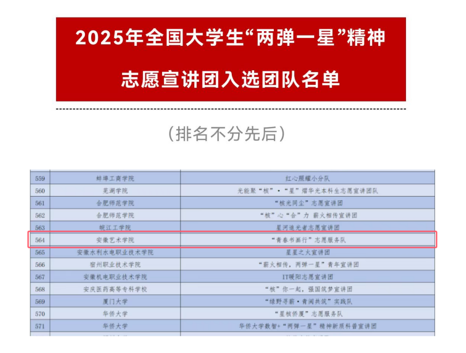 “两弹一星”精神作为中华民族的珍贵精神瑰宝,蕴含着热爱祖国、无私奉献的高尚情怀,自力更生、艰苦奋斗的坚韧品质,以及大力协同、勇于登攀的进取精神。此次入选,不仅是对“青春书画行”志愿服务队过往努力的高度认可,也是对美术学院育人成果的肯定,更是一份承载着时代使命的责任。