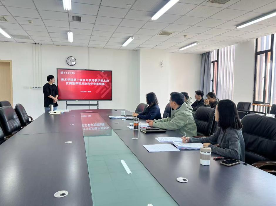 为进一步加强青年教师队伍建设,不断提高课堂教学质量和教学水平,2025年11月5日上午点十,在美术学院307会议室,美术学院“美术学院第七届青年教师教学基本功竞赛暨课程思政教学竞赛预赛”拉开帷幕。学院党总支书记陈明海、副院长李李以及美术理论教研室主任黄永飞担任此次赛事评委,对我院五位青年教师的教学比赛进行评审。