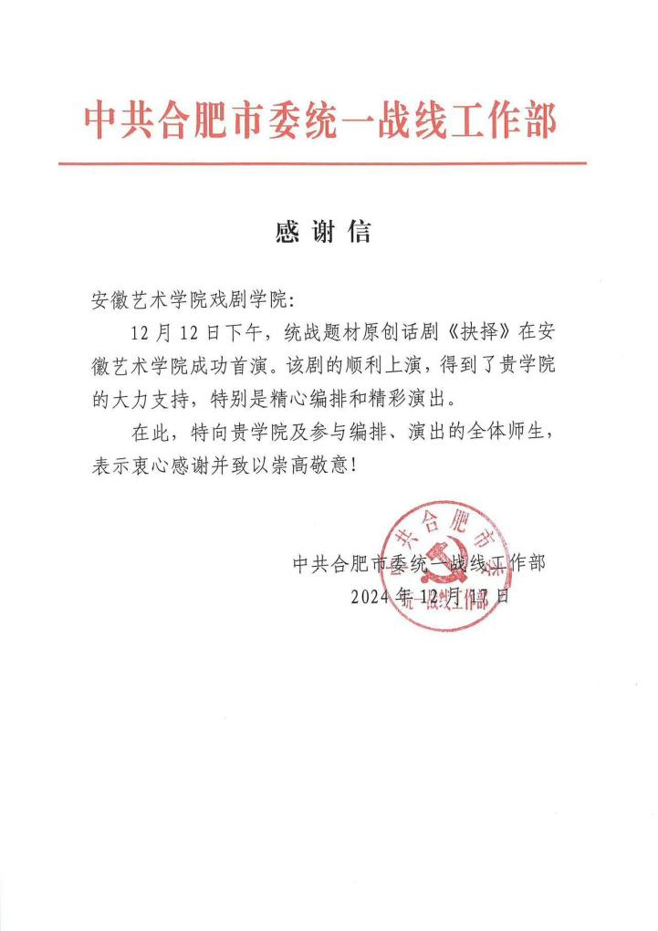 在合肥市委统一战线工作部的领导下,戏剧学院按照学校要求,编排统战题材原创话剧《抉择》,该剧成功演出成为我院统战工作的一大亮点,并受到合肥市委统一战线工作部的赞扬。