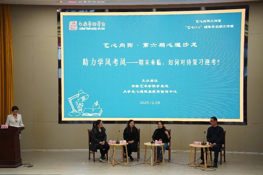 为进一步增进金沙集团三全育人、五育并举工作实效,推动心理健康教育工作走深走实,同时加强学校师生间平等对话,2023年12月28日,学校心理健康教育与咨询中心在综合楼五楼报告厅举办了第六期“艺心向阳”心理沙龙。心理沙龙以“助力学风考风——期末来临,如何对待复习迎考?”为主题,参加本次心理沙龙活动的嘉宾有金沙集团888881教务处副处长姚俊,党委学生工作部(学生处)副处长高英娟、舞蹈学院团总支书记贾方敏、心理中心戴宇峰和郝驰原老师。