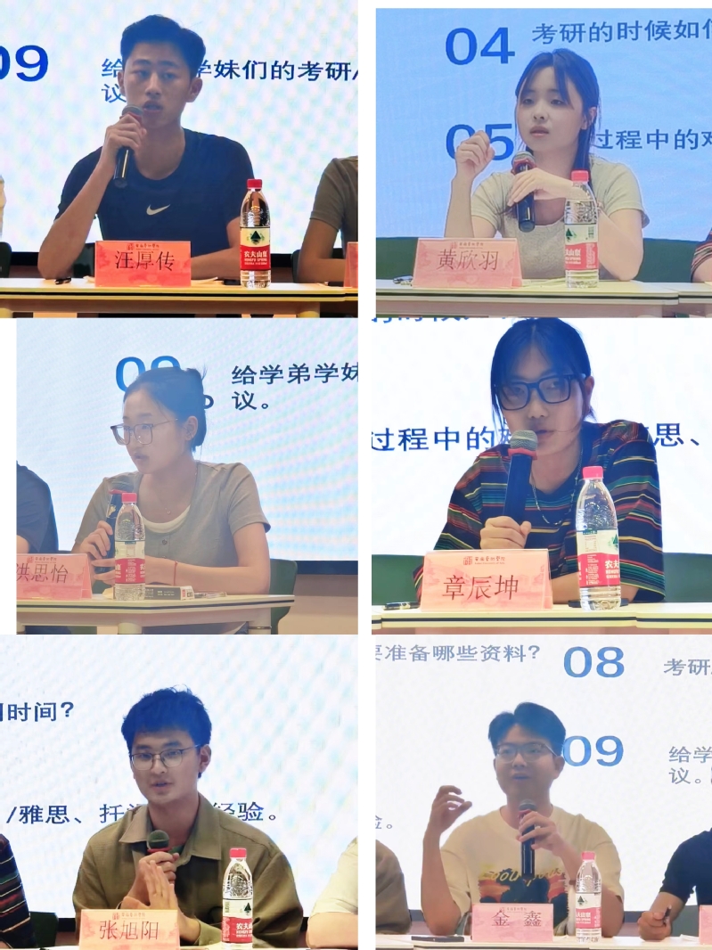本次考研交流圆桌会创新了交流形式,由台上集中经验分享与台下单个圆桌交流相结合。在集中分享环节,洪思怡、汪厚传、金鑫、张旭阳4位成功考研学生,依次讲述了自己的考研历程,以及围绕考研准备、择校技巧、备考方法、未来规划等学生比较关注的考研问题进行了解答,并结合个人经历与亲身体会给予经验分享;章辰坤、黄欣羽2位成功出国留学学生,就留学准备、出国注意事项等方面进行分享,并针对雅思、托福备考技巧等进行了详细的介绍,为同学们提供了宝贵的建议。