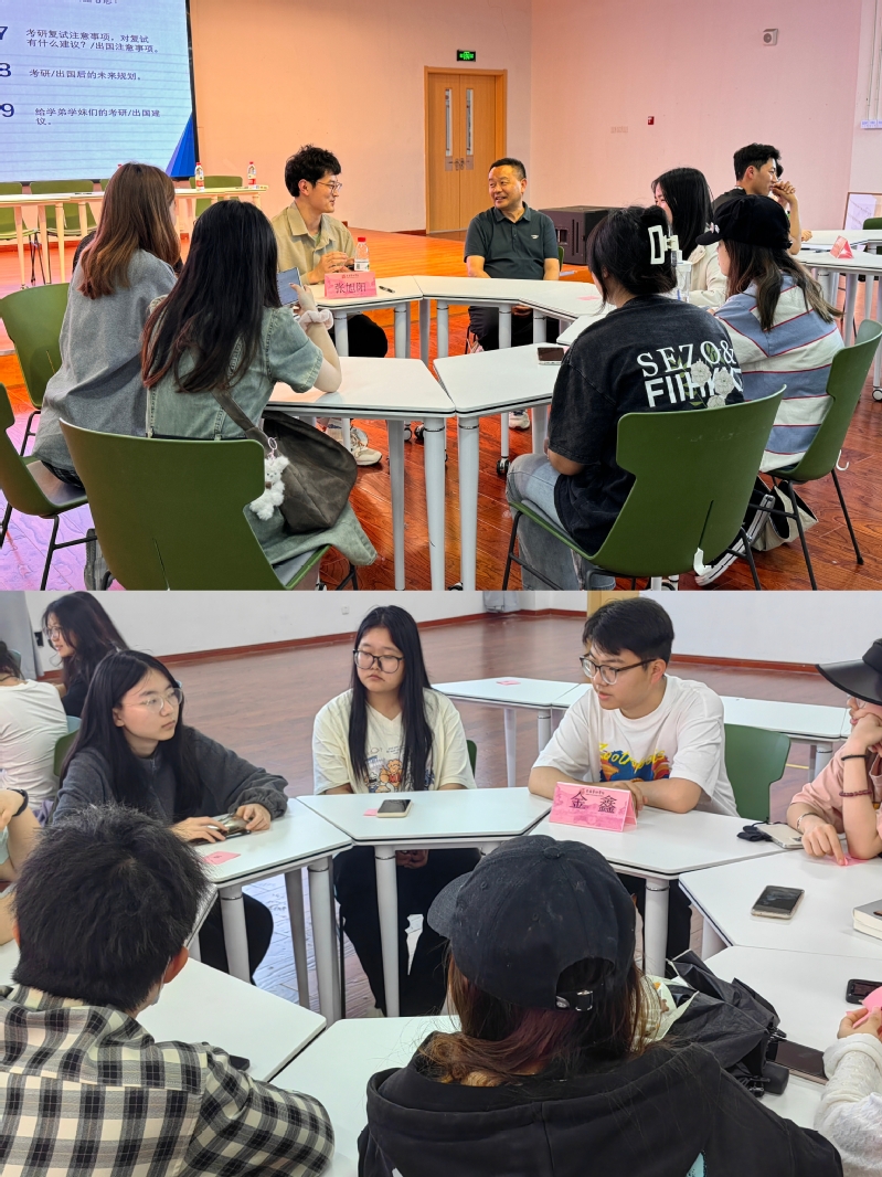 圆桌交流环节,6位学长学姐们分别走下讲台来到圆桌前,与学弟学妹们进行面对面交流与互动答疑。现场讨论氛围浓厚,学长学姐们耐心解答、倾囊相授。在一问一答间,传递备考经验,汲取研途前行的力量。