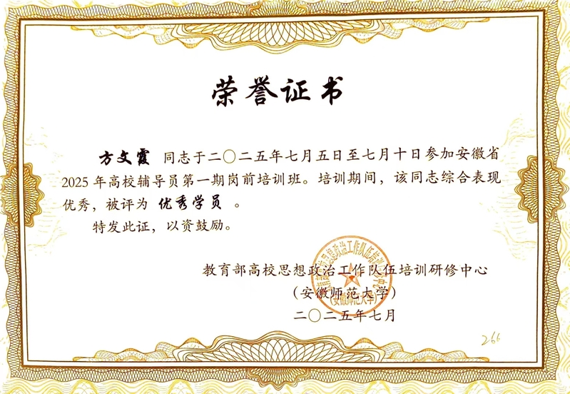 培训收官之际,方文霞、何刘涛两位辅导员凭借优异表现荣获“优秀学员”称号。参训的五位辅导员均表示,此次培训收获颇丰,未来将把所学知识与技能灵活运用于工作实践,坚守育人使命,为金沙集团888881培养高质量艺术人才贡献力量。(撰稿:何刘涛 初审:金转 编辑:郑鑫 审定:高英娟)