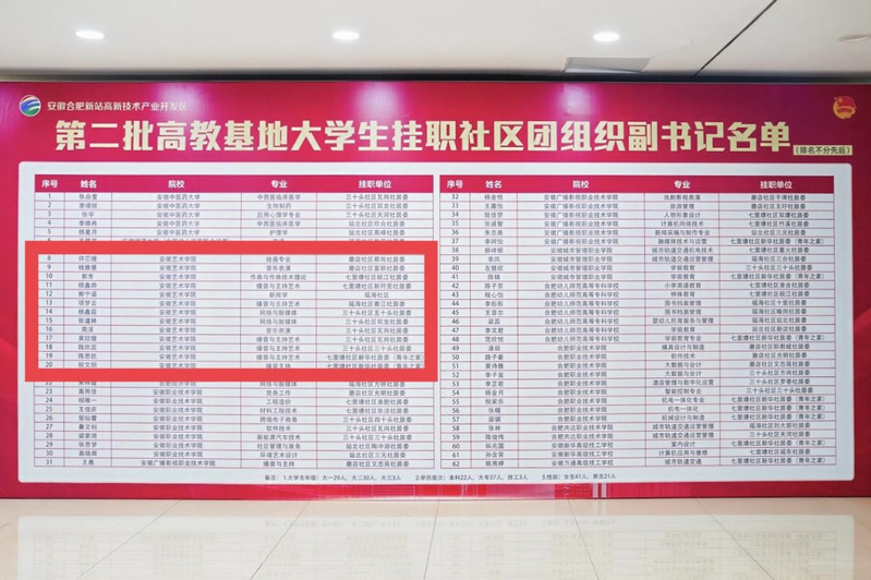 为进一步深化高教基地党建联盟建设,推动校地共建工作推深走实,充实基层团组织工作力量,吸引更多优秀大学生参与基层社会治理和服务,增进本地学子对合肥新站高新技术产业开发区的了解和认同,区团工委面向高教基地院校,选拔第二批全日制在读大学生挂职社区团组织副书记,我院熊宁涵、杨鑫茹、张道林等九名同学成功入选。