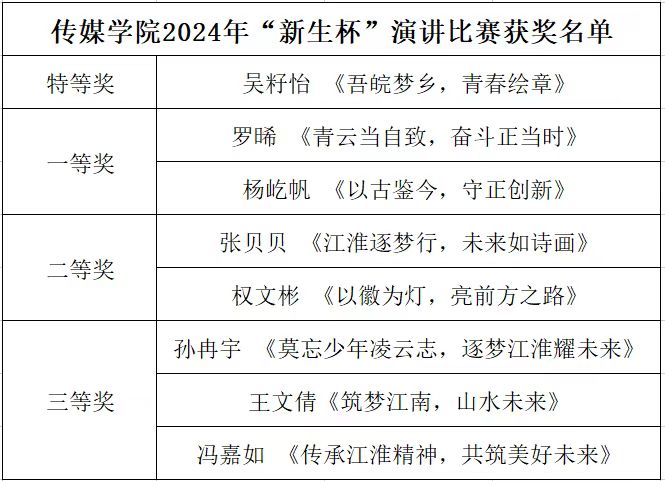 各参赛选手首先以“逐梦江淮,辉耀未来”为主题进行演讲。在随后的即兴演讲环节,选手们以声述情,精神饱满。通过展示、评比等环节,最终吴籽怡同学荣获特等奖,罗晞、杨屹帆等7名同学分获一二三等奖。
