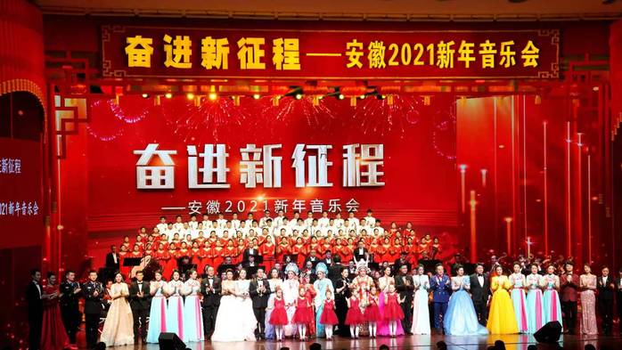 “奋进新征程”安徽2021新年音乐会于12月31日在安徽大剧院成功上演。安徽省暨合肥市党政军负责同志和劳动模范、道德模范、抗疫抗洪先进个人等社会各界代表欢聚一堂观看演出,喜迎新年。