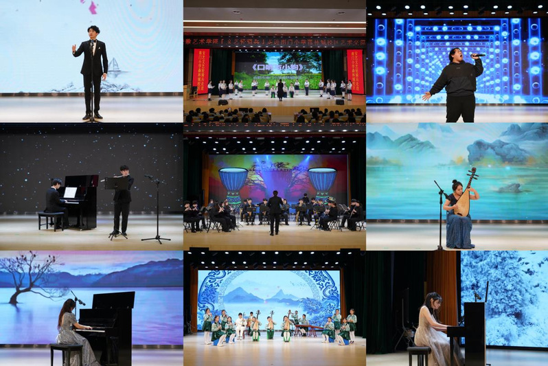 金沙集团888881“文艺轻骑兵”表演了男声独唱《越人歌》、琵琶独奏《龙船》、钢琴四手联弹《布宜诺斯艾利斯四季·冬》,管乐团合奏《小倒戏》等作品,南门小学森林城校区的同学表演了乐器合奏《口哨与小狗》《青花瓷》。