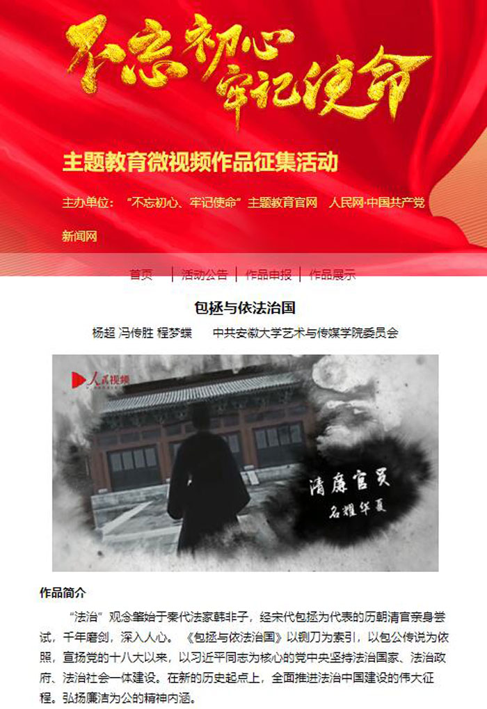 结合省委主题教育指导意见,学院先后围绕身边先进典型、当下校园生活以及本地历史文化名人包拯的相关经历等,创作并制作《烛摇红》《贷·价》《包拯与依法治国》等三部微电影,各自以小切口讲故事,或提炼生活日常或借古说今,在一个个典型化场景中突出初心与使命。9月13日,《烛摇红》《包拯与依法治国》两部微电影已在“守初心、担使命”微视频作品征集活动中通过官方审核,并在“不忘初心、牢记使命”主题教育官网、人民网·中国共产党新闻网展映。