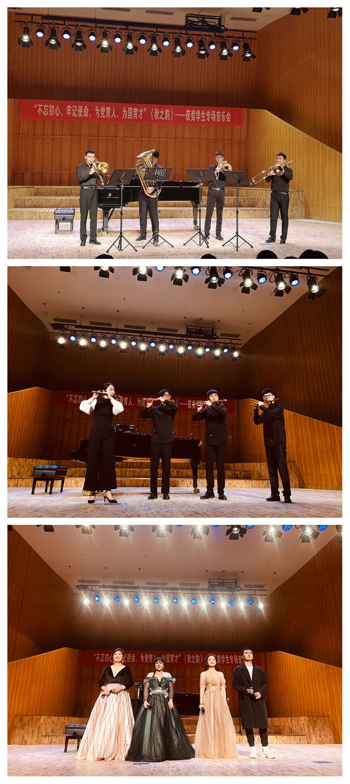 11月22日下午,由学院党委主办、学院“不忘初心、牢记使命”主题教育领导小组办公室和音乐舞蹈系承办的“不忘初心、牢记使命、为党育人、为国育才”《秋之韵》——获奖学生专场音乐会在音乐南楼音乐厅举行。学院党委书记、院长樊嘉禄及党委班子成员、学院全体中层以上干部、教职工党员与同学们一起观看了演出。